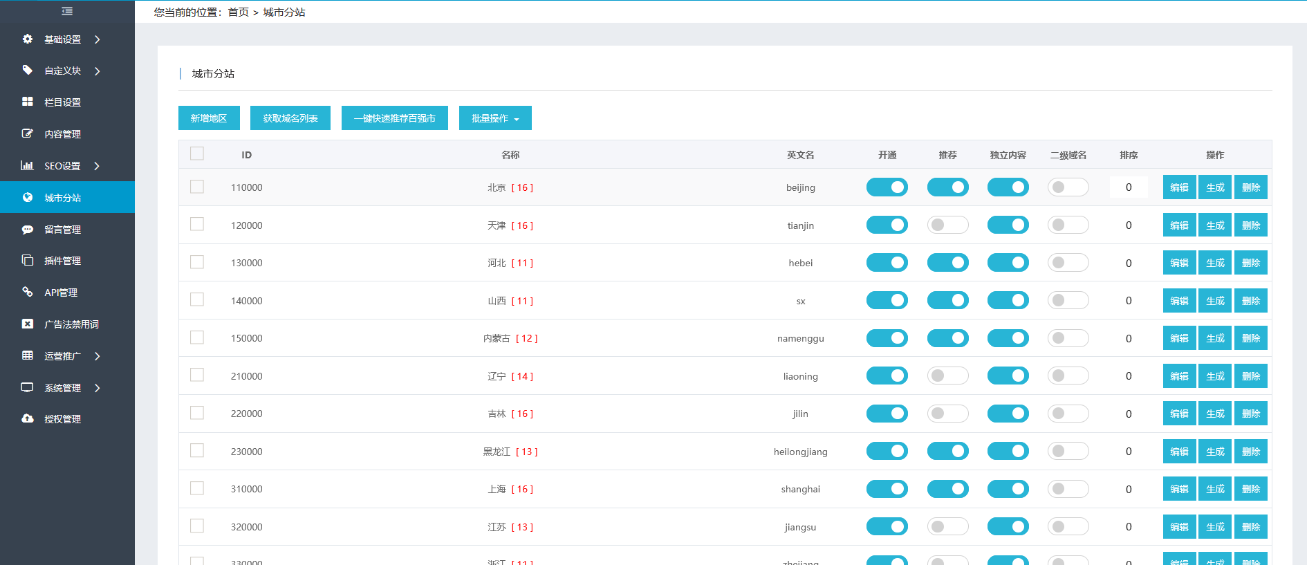 网站后台全国地区分站控制展示