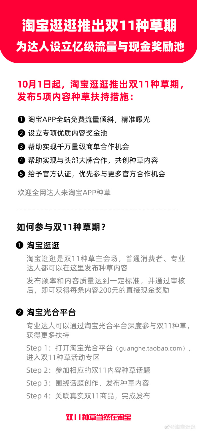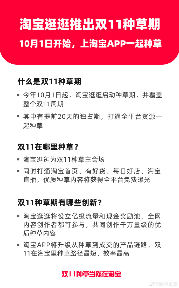 10月1日起,淘宝逛逛双11种草期5项内容种草扶持措施如下:
